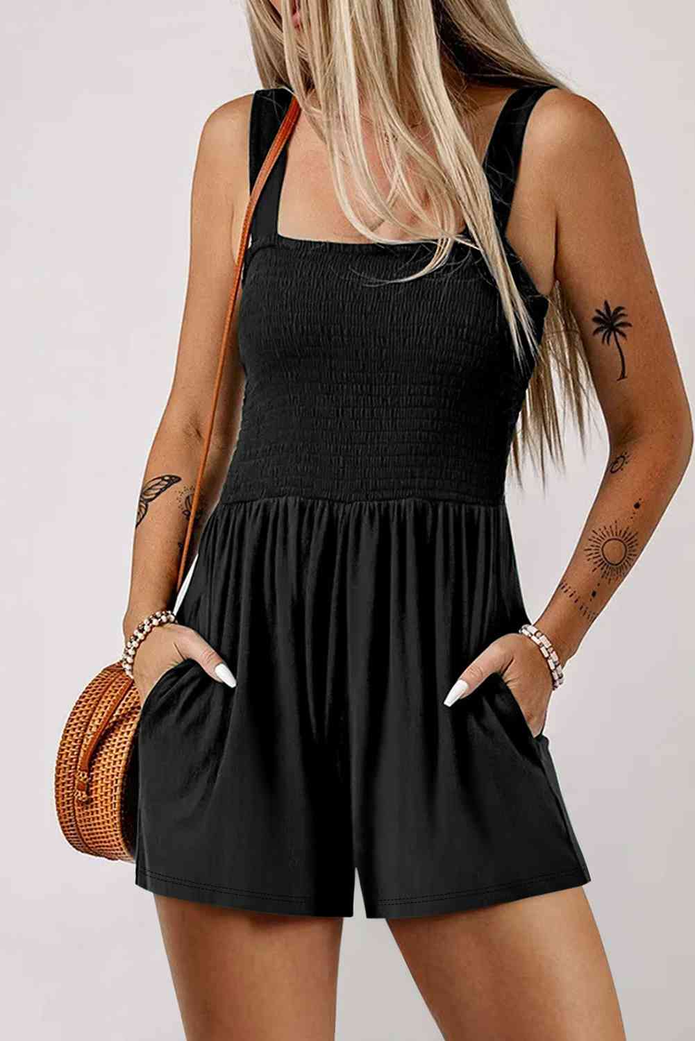 - This romper features a square neckline, sleeveless design and a chic solid pattern. It also includes a convenient pocket and smocked detailing for added style. With a shortened length, this piece is perfect for a casual look.